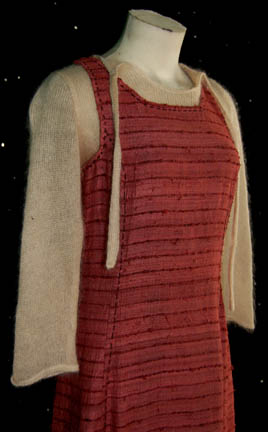 Description: A costume featured in the Star Trek: Voyager episode “Child's Play”, wherein “Icheb” (Manu Intiraymi)is returned to his home planet but “Seven of Nine” (Jeri Ryan) questions his parents motives. This costume is for wear by Tracy Ellis in the role of “Icheb’s” mother Yifay and is a sleeveless, full-length, raw silk, red dress with textured, horizontal stripes, black threading accents and an off white, knitted, half sweater sewn into the top of the dress, and a zip down the back. The costumer’s tag reads ‘239 Child’s Play, Yifay, Tracy Ellis’.