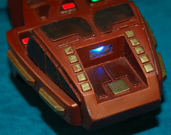 Description: The Klingons are a humanoid warrior civilization originally from the planet Qo'noS but now a strong and revered interstellar military power seen throughout the Star Trek anthology. This is a Klingon device in the 22nd Century style and presumably used on the Star Trek: Enterprise series. It is made of resin painted copper color with gold and black colored accents. A black button on the top activates a small blue strobe light on the front of the device, backlights a small gauge panel and activates five LED lights. Three lights are red, two are green. Two of the red lights flash intermittently. The device is powered by a single 9V battery (not included) that is accessed by removing the six Philips head screws and taking off the back panel. Measures approx. 6 x 3 ½ x 2 inches.