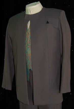 Description: A costume featured in various episodes of Star Trek: Voyager for wear by Garrett Wang in the role of “Ensign Harry Kim”, Operation Officer of the starship “Voyager”. The costume is an off-white, pleated, long-sleeved tunic with zips/clasps down the front and for cuff adjustment, a maroon vest of a paisley design, and a zip that tucks into the trousers; a long-sleeved gray suit jacket with blue, diagonal, pinstripes, a Velcro patch for a combadge (not included), corresponding trousers, and stirrups for the feet. A sewn in tag reads ‘Voyager, Garrett Wang'