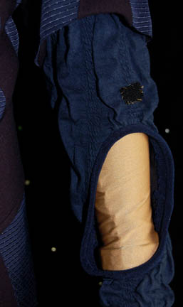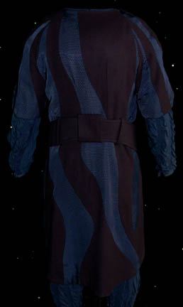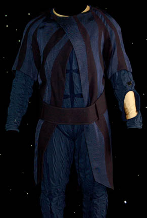 Description: A lot of costumes featured in the Star Trek: Voyager episode “Distant Origin”, wherein a reptilian race called the Voth, find evidence that links their evolution to Earth but their government refuses to accept it. This costume is for wear by Christopher Moore in the role of Tova Veer”, one of the Voth scientists proposing what they call the “Distant Origin” theory but relents to the government under scrutiny, and is a full-length, long-sleeved, blue jumpsuit featuring a textured, knotted pattern, lighter colored blue accents, open sleeve areas around the forearm for defensive dart launchers, an exceedingly long zip for the cuff adjustment, a zip up the back, corresponding, short-sleeved, blue robe that buttons around the neck and flows out diagonally, alternating dark blue strips and reflective lighter blue strips with metallic dots. A long-sleeved, tan jumpsuit minus the legs, padding sewn in with a diamond pattern, a navy blue sash across the chest, a gray tube of foam running from collar to waist, padding on the back that is half sewn in and half Velcro to hide the zip; a corresponding leggings with similar padding in the thighs, and sewn in feet. Lot includes an extra tan jumpsuit and brown leggings minus the padding and accessories. A sewn in tag reads ‘Voyager, Christopher Moore' and the costumer’s tag reads ‘165 Distant Origins, Veer, Christopher Moore’.
