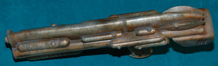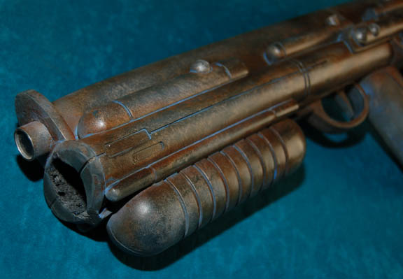 Description: A Mine Guard weapon from the Star Trek: Enterprise episode “The Xindi” in which the crew of the NX-01 found a lead to a single Xindi working on a isolated mining colony. The weapon is made of cast foam rubber painted copper color and brushed to appear distressed. Measures approx. 18 ½ x 7 x 3 ¾ inches.