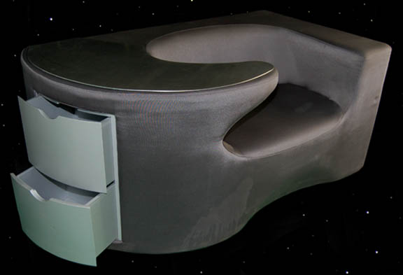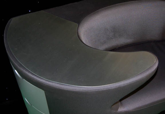 Description: An impressive Ready Room couch that was featured in multiple Star Trek: Enterprise episodes and in the style that appeared in “Captain Archer's” (Scott Bakula) Ready Room. The couch is padded gray fabric with a swooping built in desk. The desk portion has a metal top with a few scratches due to time and use and there are two drawers on the right side. There is a small stain on the left armrest and a larger stain on the front. For convenience the couch is on wheels for ease of positioning. Measures approx. 62 x 35 x 29 inches.
