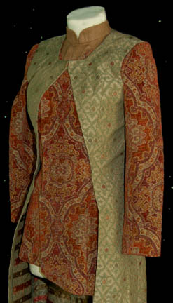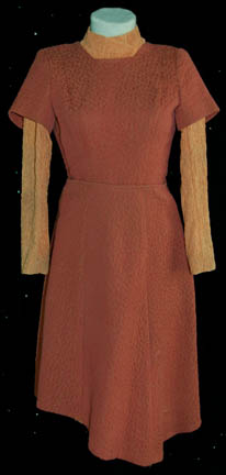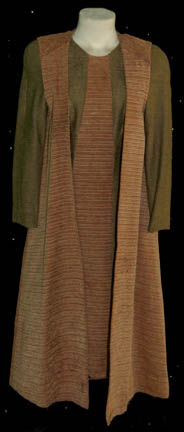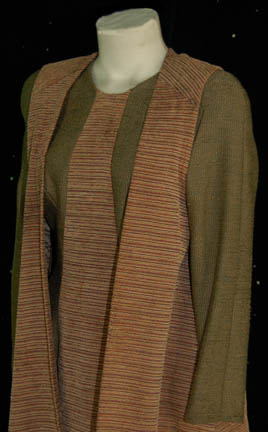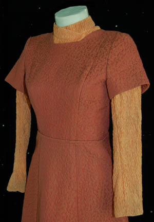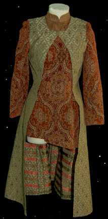 Description: A lot of costumes featured in the Star Trek: Voyager episode “Homestead”, wherein “Neelix” finds several hundred of his own people living inside an asteroid that is constantly being bombarded by some miners who claim they own it. The costumes are for wear by Julianne Christie in the role of “Dexa”, the Talaxian woman that Neelix ends up falling in love and staying with on the asteroid, and are a long-sleeved, full-length olive colored dress featuring a panel down the front that has horizontal stripes in white and shades of red, a brown dickie, a sleeveless robe of the same color and design as the striping on the dress; a short-sleeved, reddish orange dress with a textured feel, long sleeves sewn in under the short ones and a dickie of a crinkly fabric, a zip up the back, and a corresponding asymmetrical hemmed skirt. A sleeveless tan robe with a green diamond pattern, various colored spots in the middle, and clasps at the neck; a light sage colored dress in a heavy material, an extremely intricate pattern embroidered on the entire surface of the dress, a wrap around panel on the front that buttons in place and zips closed. A sewn in tag on four out of the five articles reads ‘Voyager, Julianne Christie'