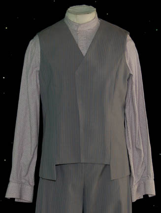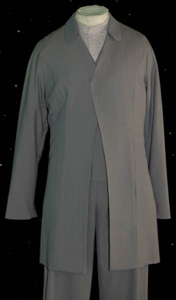 Description: A costume featured in the Star Trek: Voyager episode “Ex Post Facto”, wherein “Lieutenant Paris” (Robert Duncan McNeil) is convicted of murder but denies the charge even though the victim's own memories seem to convict him. The costume is for wear by Ray Reinhardt in the role of the Banean physicist who was reputedly murdered by “Lieutenant Paris”, Tolen Ren”, and is a long-sleeved button down shirt with a red “x” pattern and blue stripes, a gray, pinstripe suit jacket, short collar, that only buttons about halfway down, corresponding overall style trousers, and a pair of gray socks. Also included in this lot is an additional shirt, a corresponding vest that was used in a later episode of Star Trek: Enterprise, additional identical trousers, and some extra fabric like that that was used for the jacket and vest. A sewn in tag reads ‘Voyager, Ray Reinhardt’ and the costumer’s tag reads ‘108 Ex Post Facto, Tolen Ren, Ray Reinhardt’.