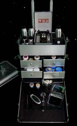Description: “Dr. Phlox” (John Billingsley) of the Denobulan race joined the NX-01 Enterprise from earth where he was part of the Interspecies Medical Exchange. This impressive Away Team kit was made for use by Dr.Phlox during the Star Trek: Enterprise series. The metal rolling case has a removable top to reveal a trio of size adjustable compartments; the lid fastens with two latches on either side of the container's exterior. The front of the container opens out on hinges on the bottom to reveal four approx. 6 X 3 X 6.5 inches drawers that each contains several items apiece. Under the drawers there is another compartment that measures approx.14 X 7 X 5.5 inches with its own goodies. The contents of the case include three aluminum pump dispensers with black plastic screw on pumps, a blue glass container with a black plastic screw on lid with affixed blue sickbay label, a rectangular metallic silver case with a ‘surgical services’ label on the outside; the item opens up to reveal a black foam core interior with metallic and resin details attached as well as ‘buttons’ on the inside. There are various 1-8oz containers and vials that are empty or actually contain undisclosed kinds of fluids, gels, jellies, lotions, wax-like substances, etc.; some of which may include iodine and Vaseline. The entire kit measures approx. 21.25 X 10.25 X 16 inches. It features externally a handle on the lid and another that telescopes from the top. Please note that any remaining substances are not for use and are for display only.
