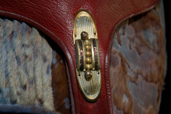 Description: This impressive costume was made for use by the “Alien Foreman” (Stephen McHattie) in the Star Trek: Enterprise episode “The Xindi”. The foreman ran a trillium mine and had to use an inhaler to breath since his lungs were destroyed by the toxic fumes from the mines. “Captain Archer” (Scott Bakula) was searching for a Xindi believed to be in the mine however the foreman refused without half a liter of platinum in return. His costume includes a sleeveless jumpsuit made of brown leather and fur with a fabric top section and an attached fur dickie. Parts of the leather are dyed blue. The collar has two straps with buckles to go around the neck. The jacket is made of ribbed fur and leather also with parts of the leather dyed blue. Attached to the jacket are leather straps and buckles. Three metal bottles painted to match the rest of the costume are on the front with tubes that connect with a faux valve. The valve has a tube that connects to a faux breathing mask and monocle. The breathing apparatus attaches the jacket with snaps on the shoulders. The costume is complete with a leather belt and corresponding fingerless gloves. Costume comes complete with costume tag.