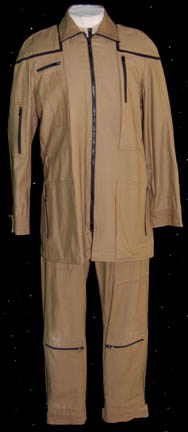 Description: This amazing “Captain Archer” (Scott Bakula) desert Starfleet uniform was made for wear in the Star Trek: Enterprise episode “Desert Crossing” in which Archer and “Trip” (Connor Trinneer) were invited to a desert planet after they helped fix an alien leader's ship. They soon discovered they were there under false pretenses and had to make their escape across the desert. The tan color shirt has black trim and a black zip up the front. On the left shoulder is a famous NX-01 Enterprise patch and attached to the left side of the collar are four captain’s rank pips. The sewn in tag reads “Enterprise - Scott Bakula, Wade Kelly”, indicating this costume was likely reused by a secondary actor or stuntman. The accompanying kaki trousers have multiple pockets and come with a black suede belt. The sewn in tag reads “Enterprise – Scott Bakula, Wade Kelly, Vince Deadrick” indicating the trousers were made for both the lead actor and his stunt doubles. The accompanying costume tag with the trousers and belt read “Archer Stunt Dbl”. The corresponding jacket was made for wear with the desert uniform and is the same kaki color as the trousers with black trim around the shoulders and multiple zippered pockets. The sewn in costume tag reads “Enterprise – Scott Backula”. The accompanying costume tag for the jacket reads “Archer, Scott Bakula – Desert jacket”.