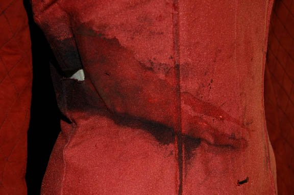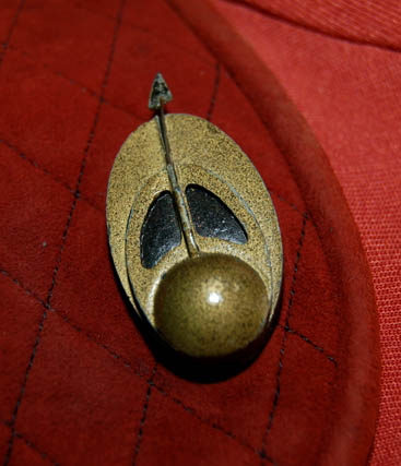 Description: “Kira Nerys” (Nana Visitor) was a Bajoran female who was a Colonel in the Bajoran Militia and later a Bajoran liaison officer on Deep Space Nine. This distressed uniform was made for wear by Kira in the Star Trek: Deep Space Nine episode “Defiant” in which she was phasered by a person claiming to be “Commander Wil Riker” (Jonathan Frakes). The costume was located with other costumes from the “Defiant” episode. The Bajoran uniform is a rose color jumpsuit with suede rust color shoulders and sleeves. The suede is stitched with black thread in a diamond motif. The jumpsuit has a zip up the back and is distressed with a hole in the left side and faux blood to signify an injury. Attached to the right side of the chest is a cast resin distressed Bajoran emblem. The sewn in tag reads, “Deep Space Nine – Nana Visitor”.