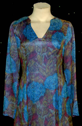 Description: “Lauren” (Hilary Shepard) was a genetically engineered Human augment who had intelligence beyond the Human level of genius however she also was delusional about her belief that many men were in love with her. This is her dress from the Star Trek: Deep Space Nine episode “Statistical Probabilities” in which “Bashir” (Alexander Siddig) tried to teach her and three other augments how to be a useful contribution to the Federation. The flowing chiffon dress is patterned shades of purple, blue and green with long sleeves and a zip up the back. Costume comes complete with costume tag.