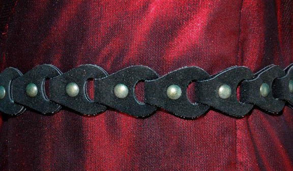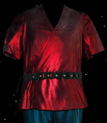 Description: A costume featured in a flashback sequence in the beginning of the Star Trek: Enterprise episode “Cold Station 12”, wherein the “Enterprise NX-01” attempts to defuse a possible war with the Klingons due to the actions of some renegade, genetically-augmented humans. The costume is one of the augments as a child and is a short-sleeved metallic looking red shirt, teal, overall style trousers with stirrups for the feet, and a black, coiled leather belt. A sewn in tag reads ‘Enterprise, Tonya Olivarez' and the costumer’s tag reads ‘Enterprise #080, 081, 082, Augment Children’.