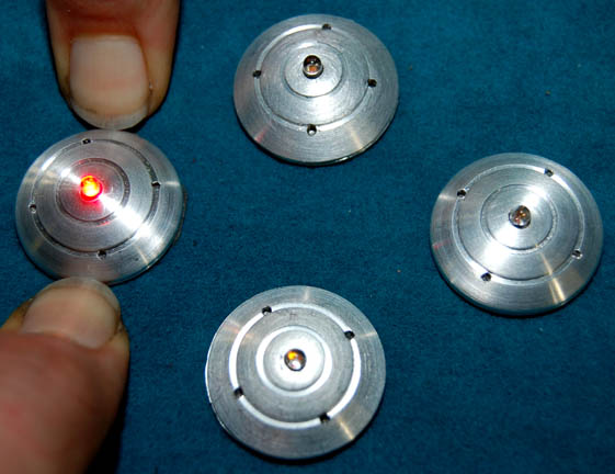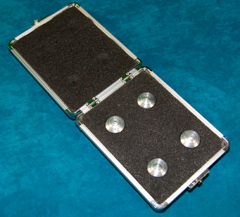 Description: A lot of props and their corresponding case featured in the Star Trek: Enterprise episode “Observer Effect” for use on “Hoshi Sato” (Linda Park) while “Captain Archer” (Scott Bakula) attempted to resuscitate her. The items are metal disks with a dome and a centered light which is activated when the bottom of the device is screwed in completely. Three of the lights are untested, but the fourth works and is powered by a 3volt ‘Renata' CR1025 Swiss made battery positioned positive side up inside the item. The light up one retains topstick applied to the bottom. All four of the items fit into a silver colored metal case, held in place by gray foam, the case opens on sturdy hinges and seals by way of a latch. The exterior of the case features a Starfleet inventory application with a blue background labeled ‘Defibrillation Electrodes, Model 45 – MK VII’ with a white medical cadesus. The case measures 7 X 5.25 X 1.75 inches, the electrodes measure 1 inch diameter. The item was located with an adhered label inscribed ‘leads placed on Hoshi “Observer Effect’.