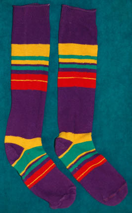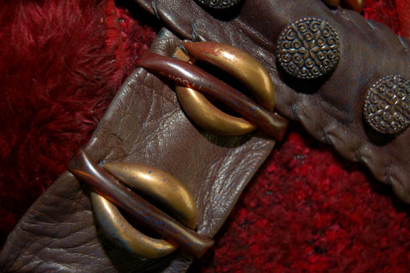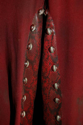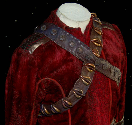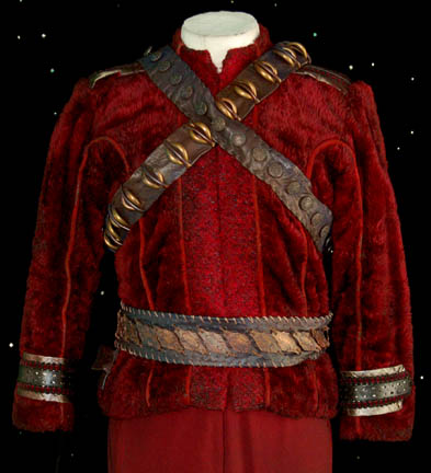 Description: A costume featured in the Star Trek: Enterprise episode “Acquisition”, wherein a group of interstellar thieves, who are obviously Ferengi but are never actually named as thus, incapacitate the crew and begin looting the “Enterprise NX-01”. This costume Is for wear by veteran cult actor Clint Howard in the role of one of the “thieves”, “Muk” and is a sleeveless, full-length jumpsuit in a spandex-type material, plastic button and alligator skin print, maroon vinyl accents along the inside of the legs; a long-sleeved, jacket with maroon fur, wool accents down the front, vinyl epaulettes, and cuff accents, further maroon piping, a zip that tucks into the jumpsuit, matching vinyl gloves, and purple striped socks. Also included is a wide leather belt with beaten metal shapes tied to the belt with more leather string, two vinyl belts that go across the chest as a bandolier; one with intricately carved buttons and the other copper colored rings that are bent on the ends. Clint Howard is the older brother of Ron Howard. A sewn in tag reads ‘Enterprise, Clint Howard, 019' and the costumer’s tag reads ‘Enterprise 019 Acquisition, Muk, Clint Howard’.