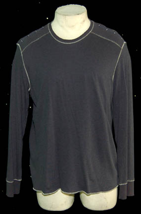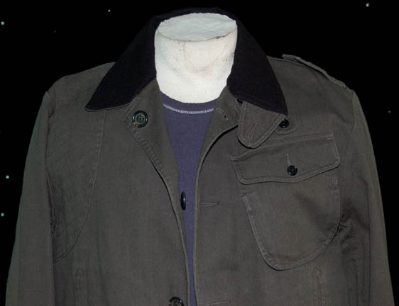 Description: A costume featured in the Star Trek: Enterprise episode “Carpenter Street”, wherein “Captain Archer” (Scott Bakula) and “T'Pol” (Jolene Blalock) go back to 21st century Detroit to stop a group of Xindi-Reptilians”. This costume is for wear by Scott Bakula in the role of the captain of the starship “Enterprise NX-01”, “Jonathan Archer”, and is a blue, long-sleeved shirt featuring white stitched accents, and a dark green coat, black collar, epaulettes, and numerous pockets inside and out. A sewn in tag reads ‘Enterprise, Scott Bakula’.