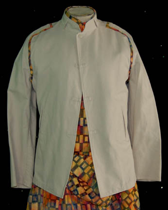 Description: A costume featured in a deleted scene from the Star Trek: Enterprise episode “Two Days and Two Nights”, wherein several members of the “Enterprise NX-01” crew go down to the pleasure planet of Risa for a short vacation. This costume was for wear by Dennis Cockrum in the role of the Risan representative that “Captain Archer” negotiated their payment for their stay on Risa, “Freebus”, and is a sleeveless kilt of some sort with a multicolored square pattern, bunched fabric in the front, a zip up the back, a high collar to stick out under the off white, long-sleeved jacket, piping to match the design of the kilt, and corresponding trousers. A sewn in tag reads ‘Enterprise, Dennis Cockrum' anf the costumer’s tag reads ‘Enterprise #025 Two Days and Two Nights, Risan Representative, Dennis Cockrum’.