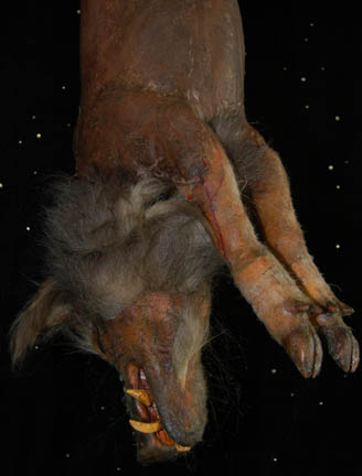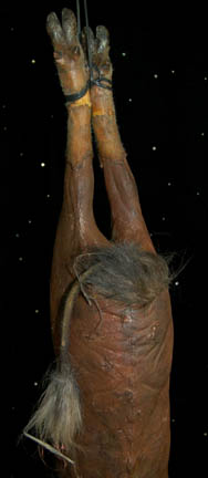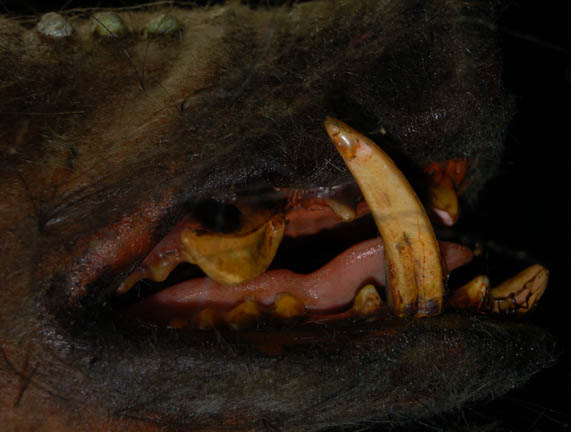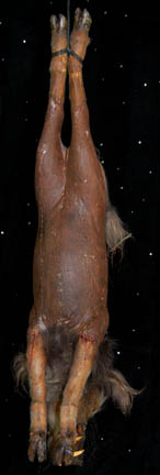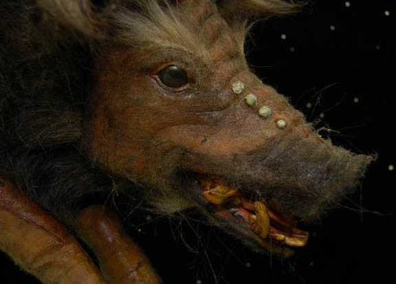 Description: A foam rubber Klingon ‘Targ' prop featured in the Star Trek: Enterprise episode “Sleeping Dogs” appearing during scenes where an away team from the “Enterprise NX-01” board a seemingly derelict Klingon starship and investigate the galley. The targ hung from bound hind feet molded into position to appear hanging with its head attached via internal cable. The item is painted to appear real, has implanted fur, tusks, teeth and eyes, a tail, and hooves. The item measures approx. 52 X 16 X 9 inches.