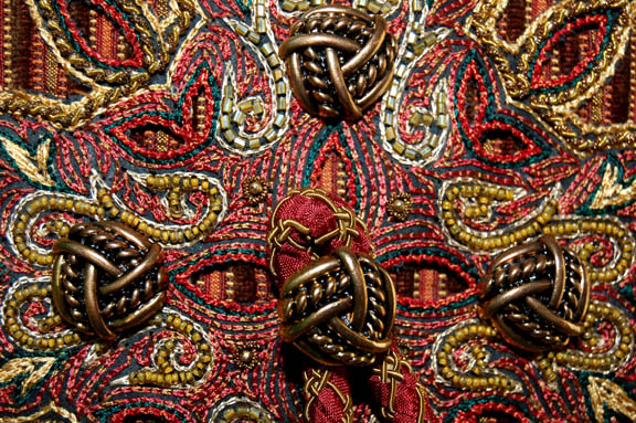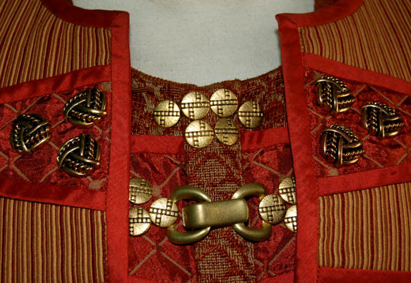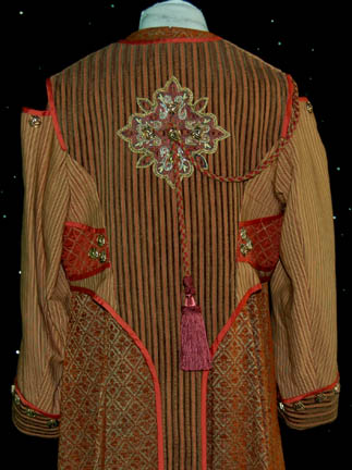 Description: A costume featured in the Star Trek: Enterprise episode “Babel One”, wherein the “Enterprise NX-01” picks up a Tellarite ambassador and journeys to a planet called “Babel” for peace talks with the Andorians. This costume is for wear by Kevin Brief in the role of the assistant to the Tellarite ambassador, “Naarg”, and is a full-length, long-sleeved robe of sage and a rust colored, diamond pattern with geometric shapes inside, numerous brass-colored buttons, slightly reflective, copper colored accents on the sleeves and along the chest, more clasps and buttons down the front; a jacket of multicolored stripes, intricately carved copper colored buttons, more of the same reflective accents, a Tellarite sigil on the back with a tassels going further down the back and over the right shoulder, open sleeves, and overall style trousers that correspond to the stripes on the jacket. This lot includes an extra pair of identical, a sewn in tag that reads ‘Enterprise, Kevin Brief #088' and costumer’s tag that reads ‘Enterprise #88 Babel One, Naarg, Kevin Brief’.