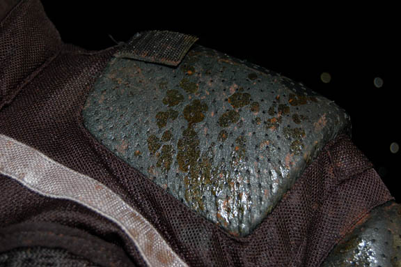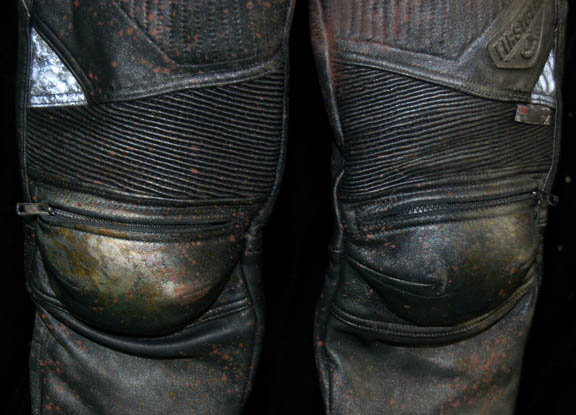 Description: An Osaarian costume made for the Star Trek: Enterprise episode "Anomaly" in which "Enterprise" is attacked by pirates. This exceptional costume is made mostly out of components garnered from motorcycle wear. It features padding in the knees, painted on distress to appear aged, and a cast resin 'transporter' device affixed to the right sleeve by Velcro that lights up in two places when activated by either of its two switches. The costume features name brand labels by 'First Gear'.
