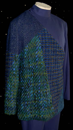 Description: A costume featured in the Star Trek: Enterprise episode “Desert Crossing”, wherein “Captain Archer” (Scott Bakula) and “'Trip’ Tucker” (Connor Trinneer) are invited to a desert-like planet by alien captain under what turns out to be completely different circumstances than they were originally told. The costume is for wear by Charles Dennis as a government official who proves of little use in locating the lost Captain and Commander, “Trilit”, and is long-sleeved blue jacket with patchwork multi-patterned panels, in shades of blue and green, along the front and right sleeve, clasps and a zip that go diagonally down the back, and corresponding blue trousers. A sewn in tag reads ‘Enterprise, Charles Dennis’ and the costumer’s tag reads ‘Enterprise #024 Desert Crossing, Trilit, Charles Dennis’.