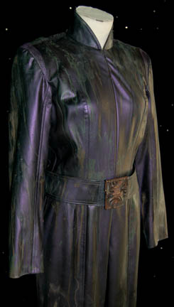 Description: A costume featured in the Star Trek: Enterprise episode “Impulse”, wherein the “Enterprise NX-01” finds a drifting hulk of a Vulcan cruiser than turns out to be not so empty and the Vulcans aboard have been poisoned by the Trellium-D they had been using to line their hulls as proof against the spatial anomalies in the Expanse. The costume is a blackish purple full-length vinyl jumpsuit with matching belt that has been distressed to appear as if the Vulcans wearing them had been stumbling around their ship in a poisoned stupor. A sewn in tag reads ‘Enterprise, Carol Abney, 051'.