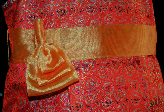 Description: “Molly O'Brien” (Hana Hatae) was the daughter of “Miles O’Brien” (Colm Meany) and “Keiko” (Rosalind Chao) who was born on board the U.S.S. Enterprise D in the Star Trek: The Next Generation episode “Disaster”. As a child she made the majority of her Star Trek appearances during the Star Trek: Deep Space Nine series. This adorable little dress was made for use by Molly during the Deep Space Nine series. It is orange with an embroidered floral pattern, two pleats in the front and a yellow sash around the waist. The accompanying costume tag reads “DS9, All Shows – Molly – Hana Hatae”.