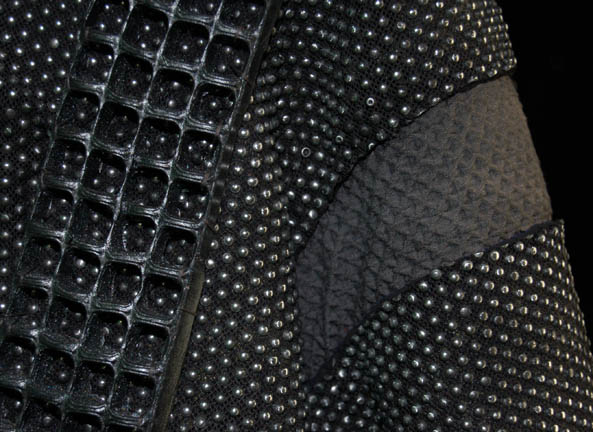 Description: When “Quark” (Armin Shimerman) finds an abandoned “Jem'Hadar” infant, “Odo” (Rene Auberjonois) is the only one who can control him. He aged rapidly and soon Odo had him in the Holodeck practicing his fighting skills against leveled opponents. This coat was made for wear by an opponent and is made of black neoprene with raised silver colored dots. A black leather belt wraps around the waist and two pieces of rubber squared armor runs from the front to the back on each side. Costume comes complete with costume tag.
