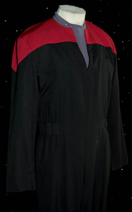 Description: “Lt. Commander Chakotay” (Robert Beltran) was a Starfleet officer onboard the U.S.S. Voyager during the Star Trek: Voyager series. Before joining the crew of the U.S.S. Voyager, Chakotay was a member of the “Maquis” that he joined to defend his home colony. This is his Starfleet uniform that includes a black jumpsuit with command red shoulders, adjustable internal waistband and a zip up the front. There are also loops around the waist. A corresponding gray long sleeved shirt is also included with two snaps on the collar for a Maquis rank pip to attach. The accompanying Maquis rank bar is made of metal and represents the rank of Lt. Commander. A small black piece of fabric is glued to the bar to create the correct rank. The sewn in tags read “Voyager – Robert Beltran”.