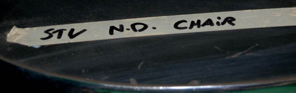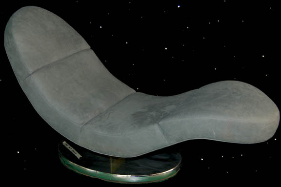 Description: This highly comfortable and relaxing chair was made for use as set dressing during the Star Trek: Voyager series. The gray padded chair rests on a reinforced bar that seems to defy logic with its narrowness however it easily supports weight and allows the user to gently rock back and forth. The bar is bolted into an oval metal base that has a piece of tape on it left over from production which reads “STV – N.D. Chair”. Measures approx. 64 x 23 ½ x 33 inches.