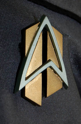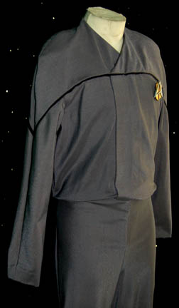 Description: An impressive futuristic gray Starfleet jumpsuit with black trim around the shoulders. There is a zip up the back, an adjustable internal waistband and a small Velcro patch on the left side of the chest for a Combadge to attach. The accompanying Combadge is in the alternate timeline style and made of resin painted gold and silver. This style of costume was featured in episodes that involved alternate timelines such as Star Trek: Voyager, “Endgame”. Costume comes complete with costume tag.