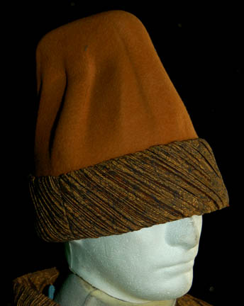 Description: A Vhnori attendant costume from the Star Trek: Voyager episode “Emanations” in which “Harry Kim” (Garrett Wang) was trapped on the Vhnori homeworld while investigating mineral deposits on an asteroid. The costume includes a pale teal spandex jumpsuit with long sleeves and a triple layered over dress with thick straps. The top layer of the over dress is heavy lace and the bottom two layers are two types of teal colored fabric with pleats. It fastens at the front with snaps. Worn over the top is a sleeveless full length pleated mustard and black robe. The corresponding hat is formed tan felt with a pleated mustard and black rim. Costume comes complete with costume tag.