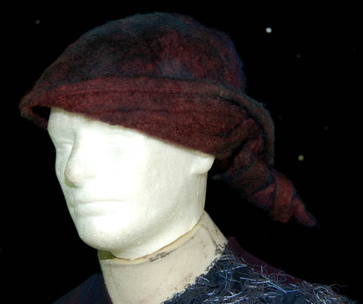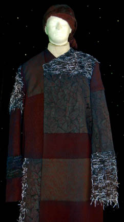Description: “4 of 9” (Tim Kelleher) was “P'Chan”, from the race known by the Borg as ‘Species 571’. He was assimilated by the Borg and featured in the Star Trek: Voyager episode, “Survival Instinct” in which he and two other ex-Borgs were encountered by “7 of 9” (Jeri Ryan) after they’d been separated from the Collective. The multi-fabric coat is different shades of mauve with patterning and sections of course thread for detail. It fastens with snaps up the front. The corresponding trousers have one molted mauve colored leg and a mauve patterned leg. The costume is complete with a molted mauve head wrap. Costume comes complete with costume tag.