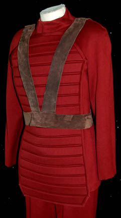 Description: The U.S.S. Voyager's first encounter with the Nygean species was in the Star Trek: Voyager episode “Repentance” in which the Voyager rescued one of their prison ships and passengers. This costume was worn by a Nygean guard and includes a burgundy coat that snaps shut up the right side and has a padded front section. The corresponding trousers are also burgundy. Worn over the coat is a brown suede harness that fastens with Velcro. Costume comes complete with costume tag.