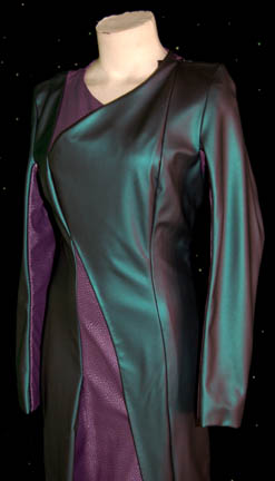 Description: “Jisa” (Mimi Craven) was a Vaadwaur soldier and wife of “Gedrin” (Jeff Allin) featured in the Star Trek: Voyager episode “Dragon's Teeth”. Along with six hundred other Vaadwaur, Jisa went into stasis after her homeworld was attacked however the stasis equipment malfunctioned and she died. The iridescent purple vinyl dress has long sleeves and a purple variation section down the front. The inside sleeves and collar are also a purple variation and there is a zip up the back. Costume comes complete with costume tag.