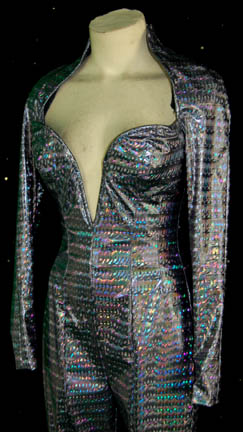 Description: “Alandra” (Elizabeth Goldstein) was a holographic Bolian woman created by the Kadi ambassador “Tomin” (Scott Thompson) in the Star Trek: Voyager episode “Someone to Watch Over Me” in which Tomin wished to experience humanity. Alandra and her friend “Tria” spent time with him in the holoprogram of “Tom Paris'” (Robert Duncan McNeill) ‘Chez Sandrine’. The sexy jumpsuit is metallic purple vinyl with built in bustier and zip up the back. Costume comes complete with costume tag.