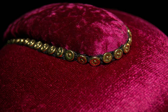 Description: A costume featured in the Star Trek: The Next Generation episode “The Most Toys”, wherein a devious trader fakes “Commander Data's” (Brent Spiner) death so that he can be added to his collection of “antiquities”. This costume is for wear by Saul Rubinek in the role of the pernicious trader “Kivas Fajo”, and is a long-sleeved, leg-less, leotard that is half purple velvet and half a stretchy purple fabric with gold trim around the collar, and decorative sewn cuffs. Also included is a purple jumpsuit that fits over the leotard with corresponding purple velvet and gold trim stripes that go diagonally down from the right shoulder, equestrian style trousers, matching purple/gold leather belt, a zip down the back, and stirrups for the feet; an interesting hat made of latex with purple velveteen fabric, darker purple velvet, and gold colored accents. British actor and little person David Rappaport was the original choice for this role but sadly, he committed suicide after filming only a few scenes. His costume is full-length, long-sleeved jumpsuit made from six different fabrics in individual designs, stitched together in patchwork fashion, a blue leather belt with gold trim, zips down the top and bottom, and zip cuff adjustment around the ankles; a vest of still two more different designs in patched together in the same way, and oversized, gold cuffs.