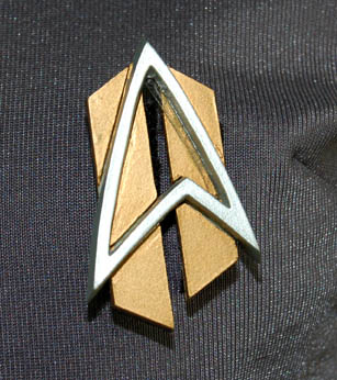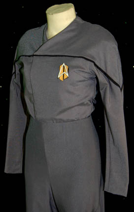 Description: An impressive futuristic gray Starfleet jumpsuit with black trim around the shoulders. There is a zip up the back, an adjustable internal waistband and a small Velcro patch on the left side of the chest for a Combadge to attach. The accompanying Combadge is in the alternate timeline style and made of resin painted gold and silver. This style of costume was featured in episodes that involved alternate timelines such as Star Trek: Voyager, “Endgame”. Costume comes complete with costume tag.