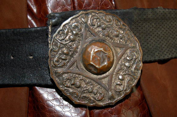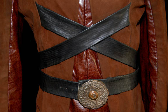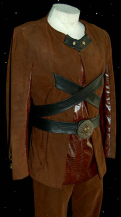 Description: “Gaul” (Robert Knepper) was a male Vaadwaur who spent over 900 years in stasis to avoid attacks from his enemies. He was featured in the Star Trek: Voyager episode “Dragons Teeth” in which he was awakened by a U.S.S. Voyager landing party and planned to seize the Voyager to attack his enemies and restore the Vaadwaur Empire. The faux suede jacket is brown with brown vinyl alligator print down the front and making up the inner sleeves. Two black bands wrap around the torso culminating in a metal buckle on the front. A black collar accent with metal detail is attached at the neck. On the right sleeve are three more metal accents. The corresponding trousers are brown faux suede with black cuffs. Costume comes complete with costume tag.