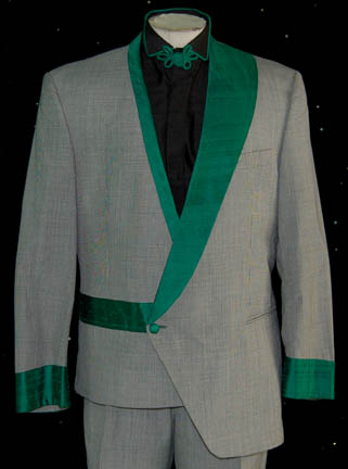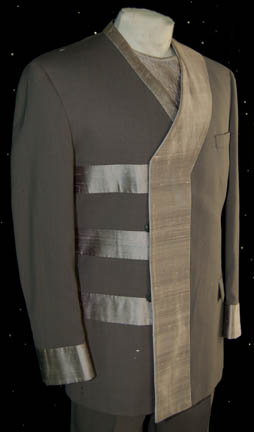 Description: A costume featured in Star Trek VI: The Undiscovered Country for wear by a ‘munitions dealer'. The lot is composed of two costumes, both changes for the character portrayed by Carlos Cesteros. Change number one is a gray colored suit with trousers, a long sleeved tee-shirt with snaps for the attachment of a pleated dickie, and a gray double breasted jacket with silver colored accents, faux and functional pockets. Change number 2 is a pair of black button front long sleeved shirts with green piping around the collar and an oriental style bow at the neck, and a hound’s tooth jacket with green collar accents and cuffs, with multiple interior pockets and one on the front with matching trousers, sans green accents. The costumer’s tags read ‘Munitions Man, Carlos Cesteros, Ch#1, Sc., with black StarFleet zipper boots, S.T. VII’, though no boots are present, and ‘Star Trek VI, Carlos Cesteros, Munition’s Salesman, Change 2, Khitomer Conference, with black Starfleet style boots’, though no boots are present.