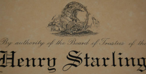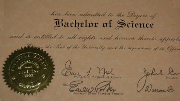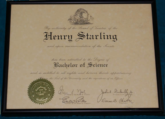 Description: ‘Henry Starling' (Ed Begley, Jr.) was featured in the Star Trek Voyager episodes “Future’s End Part I and Part II”. A native of Earth, Starling was largely responsible for its computer revolution towards the end of the 20th century. The first piece is his “Collector’s Emporium Honors” plaque for his “contribution to the future of exotic collections”. The plaque is made of particle board made to look like gray marble. The metal part of the plaque is engraved in gold colored lettering. The second piece is Starling’s diploma for his “Bachelor of Science” degree. The certificate is framed, wired on the back and has a gold colored faux seal on it. Due to time and storage, the certificate has some dents in it. Both pieces were on display in his office during the “Future’s End” episodes. The plaque measures approx. 10 x 8 inches and the diploma measures approx 11 ¼ x 8 ¾ inches.