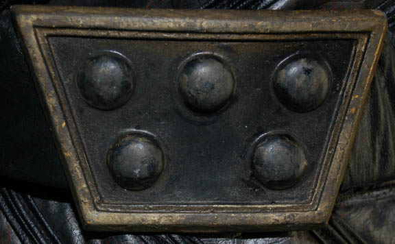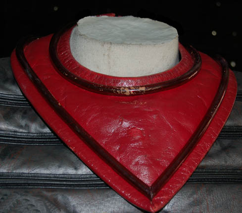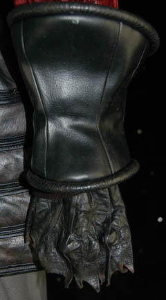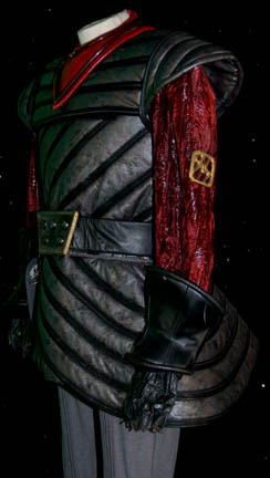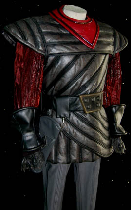 Description: A costume featured in Star Trek VI: The Undiscovered Country for wear by Christopher Plummer in his portrayal of “General Chang”, the Shakespeare quoting Khitomer conspirator whose ship, which could fire while cloaked, wreaked havoc on the “USS Enterprise-A”. The costume is a large vinyl uniform jacket with opposing lines of detail, a shoulder and chest piece, and plum colored sleeves with sparkle and texture details. The left sleeve features an affixed gold colored rubber Klingon heraldic emblem. The costume comes with gray spandex trousers, a black leather belt with a resin Klingon style buckle, a red leather gorget with tubing accents, leather clawed fingerless gloves, a pair of black leather gauntlets which were not located with the costume and a pair of gold colored metal Klingon phrase badges, a holster with two belt keepers and an inverted triangle with two metal badges affixed. The shoulder armor on the jacket is inscribed ‘Chris Plumber, “Change” w/o baldric', the belt features a label inscribed ‘Plummer’. The trousers were located separate of the costume; a costumer’s tag reads ‘Stunt Chang, Shane’, and another ‘Chang holster (not used)’, with ‘and belt’ scratched out.