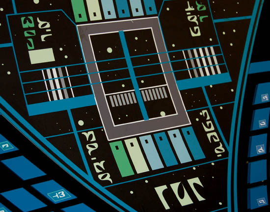Description: A prop computer console featured in multiple episodes of Star Trek: Enterprise beginning with the pilot episode “Broken Bow” where it was a Suliban console, then later in the episodes “Babel One”, “United”, and “The Aenar” where they were altered to appear as Romulan computer consoles. The item is a freestanding formed clear acrylic panel on a wood base with metal braces with screw holes for mounting onto a larger base. The item features multiple faux rubber gel buttons, a large Romulan style ‘display screen' graphic on both the front and reverse, with teal application details and Romulan iconography accents across the whole front. A lighting feature is present on the reverse which is connected to leads present on the underside of the main computer interface. The item measures approx. 60 X 29 X 25 inches.