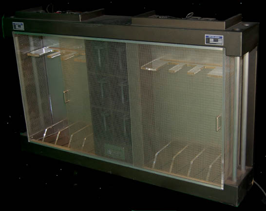Description: A one of a kind set component from the armory set of the “Enterprise NX-01” featured in various episodes of Star Trek: Enterprise. The item is composed of wood, clear acrylic components, and features two sliding grid-style doors, a faux drawer, and working lights which are powered by standard American 120volt electricity and two type-A two prong plugs which have been connected to a cube-tab for ease of activation. The light shines down into the case on either side of a center shelf with multiple openings presumably for phase pistol storage. The item measures approx. 60 X 10 X 37 inches and is meant to be affixed to a sturdy wall.
