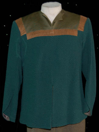 Description: A costume featured in the Star Trek: Enterprise episode “Fusion” for wear by “Kov” (John Bland), a Vulcan engineer who held multiple misconceptions of humanity. The costume is mustard colored trousers with black zigzag lines and a wrapped over cuff style at the ankles, and a green crinkle texture top with mustard and olive colored accents at the chest and neck. The sewn in Enterprise tags read ‘Jon Bland' and the costumer’s tag reads ‘Equilibrium #017, Tov, John Bland’. The episodes title “Equilibrium” had been used by Star trek: Deep Space Nine and changed to avoid confusion. Why the costumer’s tag reas ‘Tov’ instead of ‘Kov’ we can only guess.