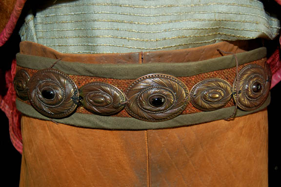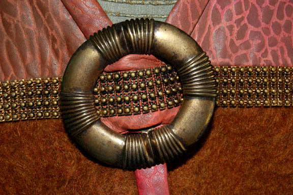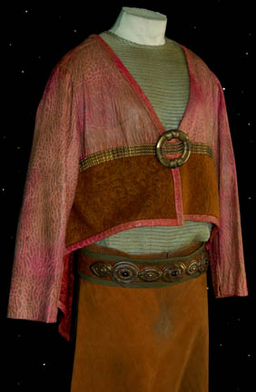 Description: A costume featured in the Star Trek: Deep Space Nine episode “Melora”, wherein an officer from a low-gravity planet comes to DS9 and is confined to a wheelchair but “Dr. Bashir” (Alexander Siddig) devises a method to rid her of it. This costume is for wear by Don Stark in the role of a Yridian merchant, “Ashrock”, and is a loose, long-sleeved, light green, raw silk, shirt featuring textured horizontal stripes, moderately distressed, two-toned suede/vinyl trousers, twine belt loops, stirrups for the feet, a rust colored belt with olive outline and carved metal medallions tied to it; a textured, pink, long-sleeved, crop top, vinyl jacket with a brown mohair-like panel along the bottom, brass-colored accents, a longer back jacket flap in a reflective red floral pattern and zip cuff adjustment. Don Stark is probably best known in the role of "Bob Pinciotti" on “That 70's show”. The costumer’s tag reads ‘429 DS9 Melora, Ashrock, Don Stark’.