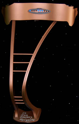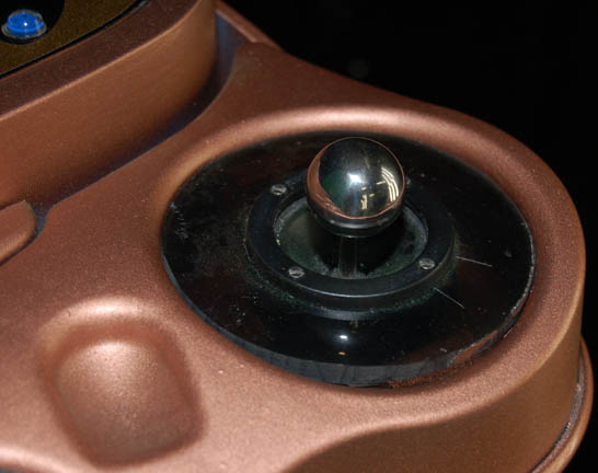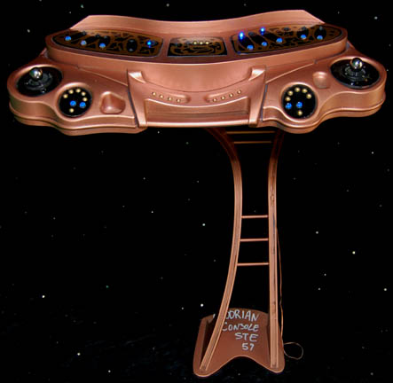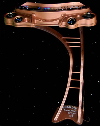 Description: A prop console featured in multiple episodes of Star Trek: Enterprise like “Awakening” where it appeared as an Andorain torture device control, then again in “Bound” where it was altered to appear as an Orion control console on “Harrad-Sar's” (William Lucking) ship. The item is a free standing console with multiple holes for mounting screws placed in its base, with a bent arm appearance to its pedestal, and a computer interface at the top. The interface is composed of wood and molded plastic elements with several inset acrylic pieces with faux rubber gel buttons adhered to them, a pair of spring centered joystick balls on either side, painted metallic bronze, and featuring an inscription on the base ‘Andorian Console STE 59’. When the right side acrylic piece is removed it reveals internal wiring connecting to the other pieces where are mounted blue lights which flash in sequence when a standard 9volt battery is plugged in (not included). The item measures approx. 29 X 25 X 46.5 inches.