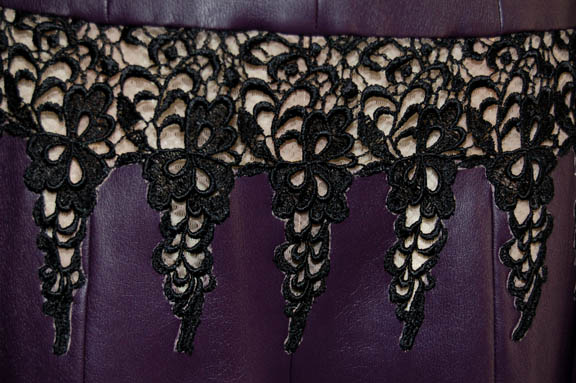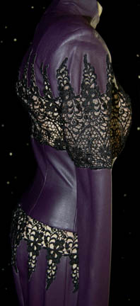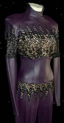 Description: A costume featured in the Star Trek: Deep Space Nine episode “Business as Usual”, wherein “Quark” (Armin Shimerman) is given the opportunity to become an arms dealer to pay off all of the debts he has accumulated. This costume is for wear by Charlie Curtis in the role of “Talura”, an alien woman who accompanied one of “Quark's” new arms dealing associates when they visited DS9, and is a long-sleeved, full-length, purple vinyl bodysuit with loose-knit, black crocheted panels across the chest, arms, and waist, a zip down the back, and stirrups for the feet. A sewn in tag reads ‘Deep Space Nine, Charlie Curtis’ and the costumer’s tag incorrectly lists ‘DS9 #516, Telure, Charlie Curtis’ when the character’s name is “Talura”.
