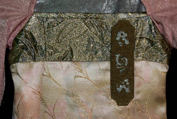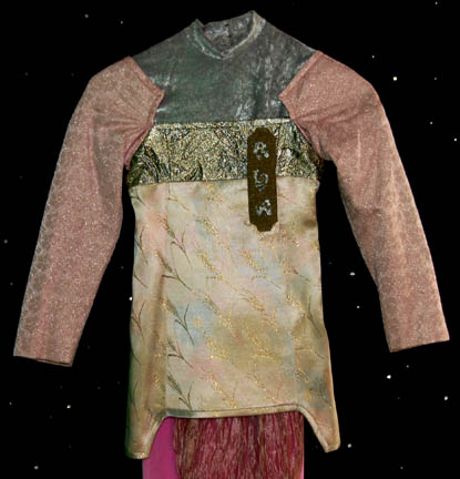 Description: A costume featured in the Star Trek: Deep Space Nine episode “Move Along Home”, wherein a species known as the “Wadi” comes to Deep Space Nine and takes four station denizens and converts them into aspects of some kind of game. This costume is for wear by Clara Bryant as an aspect of this mysterious game, “Chandra”, and is a full-length, long-sleeved, two-toned, silver/pink, velveteen jumpsuit, sewn on pink, reflective sleeves in a textured floral design, a sash in a pink, reflective, crinkly fabric, a gold and multicolored floral panel with a textured wheat print, a gold/black metallic badge featuring alien characters, and stirrups for the feet. A sewn in tag reads ‘Deep Space Nine, Clara Bryant' and the costumer’s tag reads ‘410 DS9 Sore Losers, Chandra, Clara Bryant’ but the episode was renamed “Move Along Home” after something that is said in the game.