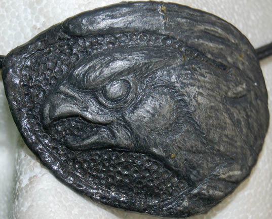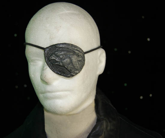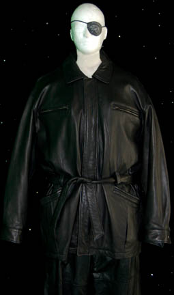 Description: A costume featured in the Star Trek: Deep Space Nine episode “Our Man Bashir” wherein sabotage traps the entire senior staff of the station in the holosuite pattern buffer that “Dr. Bashir” (Alexander Siddig) is using to play out a new secret agent program with “Garak” (Andrew Robinson), and the staff's patterns are parlayed into the program as the main characters. This costume is for wear by Colm Meaney in the role of the Chief of Operations, “Miles O’Brien”, but in the program, he is “Falcon”; it is a long-sleeved, black sweater featuring textured verticals stripes, black leather trousers, and a very soft, black, leather jacket, functional pockets, a tie around the waist, black leather shoes in the Italian style, and two eye patches with falcon design on each. A sewn in tag reads ‘Deep Space Nine, Colm’ and the costumer’s tag reads ‘DS9 Our Man Bashir #482, O’Brien/Falcon, Colm Meaney’.