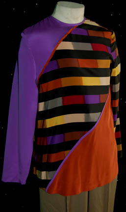 Description: A costume featured in the Star Trek: Deep Space Nine episode “Homefront”, wherein, “Captain Sisko” (Avery Brooks) and “Odo” (Rene Auberjonois) are called back to Starfleet Headquarters after it is revealed that Changelings have arrived on Earth. This costume is for wear by Cirroc Lofton as “Captain Sisko's” son, “Jake Sisko”, and some tan trousers, a long-sleeved shirt featuring diagonal panels of purple, black and multicolored horizontal stripes, and rust color. A sewn in tag reads ‘Deep Space Nine, Cirroc Lofton’.