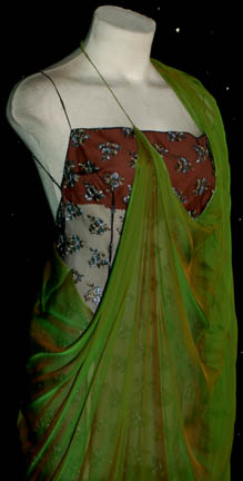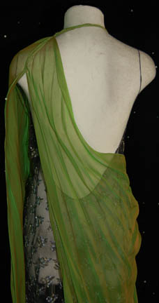 Description: A costume featured in the Star Trek: episode “Wrongs Darker than Death or Night”, wherein “Major Kira” (Nana Visitor) uses the Orb of Time to prove to herself whether “Gul Dukat's” allegations that he knew her mother and that she left her father for him. This costume is for wear by Leslie Hope in the role of “comfort woman” to “Gul Dukat” and “Kira Nerys’s” mother, “Kira Meru”; and is a black mesh dress with textured, silver, and gold colored flower accents, a flesh colored undergarment, and an iridescent green wrap that hangs on the right shoulder and drapes under the left arm. A sewn in tag reads ‘Deep Space Nine, Leslie Hope’ and the costumer’s tag reads ‘DS9 #541, Meru, Leslie Hope’