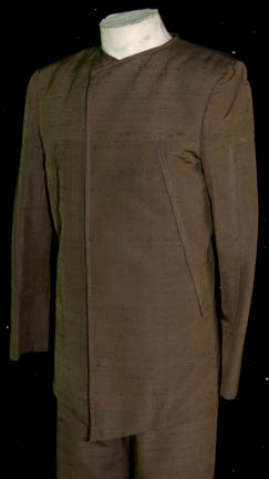 Description: A costume featured in the Star Trek: Deep Space Nine episode “Honor Among Thieves”, wherein “Chief O'Brien” (Colm Meaney) infiltrates the Orion Syndicate to ascertain the identity of the Syndicate’s mole in Starfleet Intelligence. This costume is for wear by Nick Tate in the role of the man who brings “Chief O’Brien” into the Syndicate and befriends him, “Liam Bilby”, and is a long-sleeved brown jacket with thin horizontal black stripes, diagonal accents, matching overall style trousers, and stirrups for the feet. The costumer’s tag reads ‘DS9 539, Bilby, Nick Tate’.